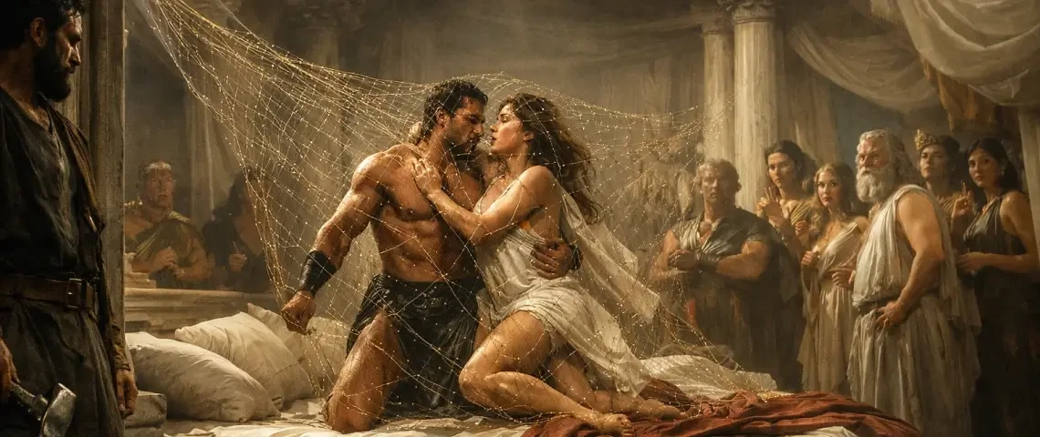 Afrodit ile Ares’in gizli ilişkisi, Hephaistos’un kurduğu görünmez tuzakla ortaya çıkar. Olimpos’ta yaşanan bu olay, Yunan mitolojisinde aşk, ihanet ve zekânın çarpıştığı en çarpıcı hikâyelerden biridir.