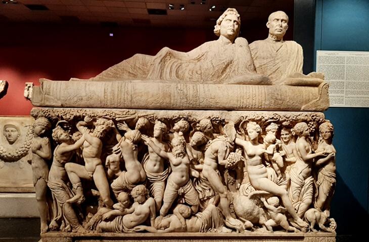Görebileceğiniz en güzel işçiliğe sahip lahitlerden birisidir. Attika yani Atina’da yapılmış olan bu lahit, M.S. 3. yüzyıla tarihleniyor. Perge’de 2003 yılında bulunan lahidin üzerinde bir kadın ve erkek çift uzanır vaziyette yapılmış. Ayrıca yanlarda ise Dionysos adına düzenlenen Dionysiak törenlerinden sahneler, satyrler, mainadlar ve bağ bozumu sahneleri yer alıyor.
