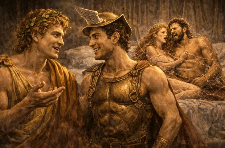 Bazı anlatımlarda Apollon’un Hermes’e dönüp, “Böyle bir durumda olmayı ister miydin?” diye sorduğu aktarılır. Hermes’in cevabı ise nettir: “Evet, yeter ki Afrodit ile olsun.” Bu diyalog küçük görünür ama çok şey anlatır. Çünkü burada mesele ihanet değil, elde edilen şeydir. Yani sahne, bir suçun cezalandırılmasından çok, bir durumun izlenmesine dönüşür.