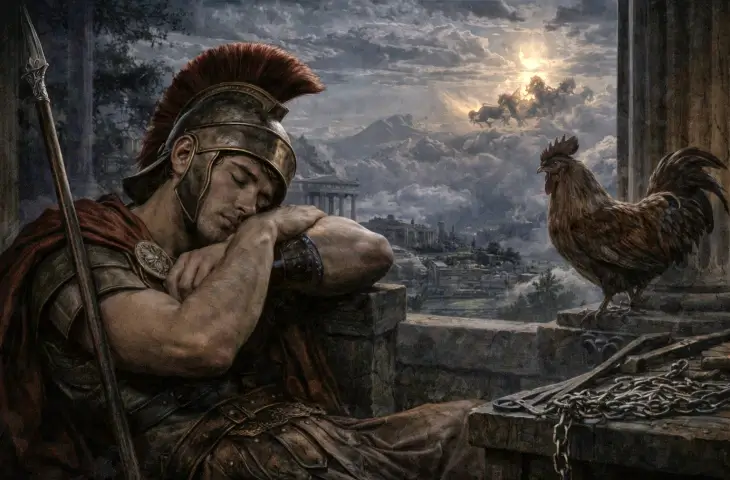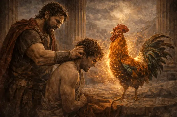 Bunun üzerine Ares, Alectryon’u cezalandırır. Onu bir horoza çevirir ve her gün güneş doğarken ötmek zorunda bırakır. Bu dönüşüm, yalnızca bir ceza değil, aynı zamanda bir hatırlatmadır. Kaçırılan o anın, artık her sabah yeniden yaşanması gibi.