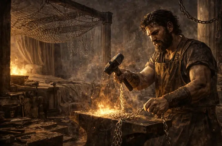 Hephaistos bu ilişkiyi öğrendiğinde verdiği ilk tepki açık bir patlama değildir. Hikayenin en dikkat çekici yanı da burada başlar. Çünkü onun öfkesi dışarıya taşan, gürültülü, anlık bir öfke değildir. İçeri çekilen, işlenen ve biçim verilen bir öfkedir. Homeros’un anlattığı en eski versiyonda, Helios’un gördüklerini haber vermesiyle Hephaistos doğruca ocağına gider; kalbi yaralanmıştır ama eli titremez. Öfkesini bağırarak değil, demiri işleyerek gösterir.