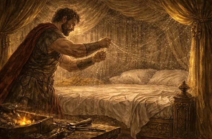 Tuzak nereye kurulur sorusunun cevabı da önemlidir. Çünkü Hephaistos rastgele bir alan seçmez. Ağı doğrudan kendi evine, daha da özeli evlilik yatağının çevresine yerleştirir. Direklere, karyolanın çevresine ve yukarıdan kirişlere kadar uzanan bir düzen kurar. Böylece kapan yalnızca odayı değil, ihanetin gerçekleşeceği anı hedef alır. Bu ayrıntı hikayeyi daha sert hale getirir. Hephaistos onların bir yerde buluşacağını tahmin etmez; tam olarak kendi yatağını seçer. Yani mesele yalnızca eşinin başka biriyle olması değildir. Kendi evinde, kendi düzeninin içinde, kendi yerine başka birinin girmesidir. Bu yüzden tuzağın kurulduğu yer de bir rastlantı değil, bilinçli bir tercihtir.