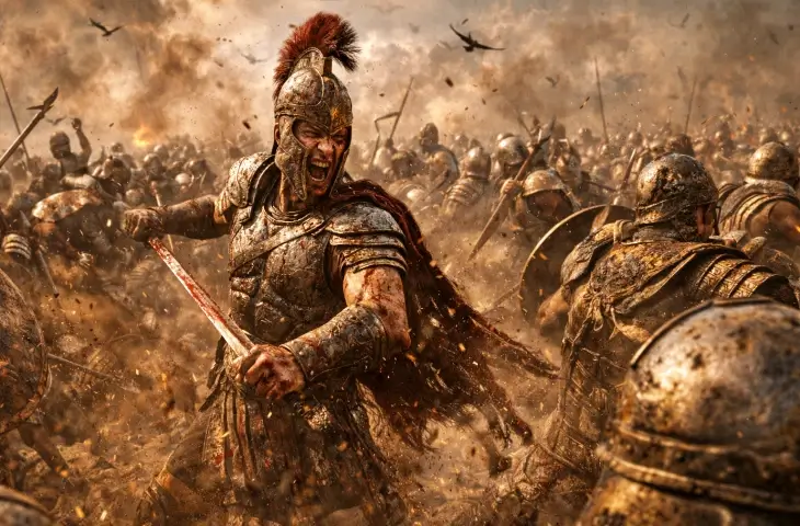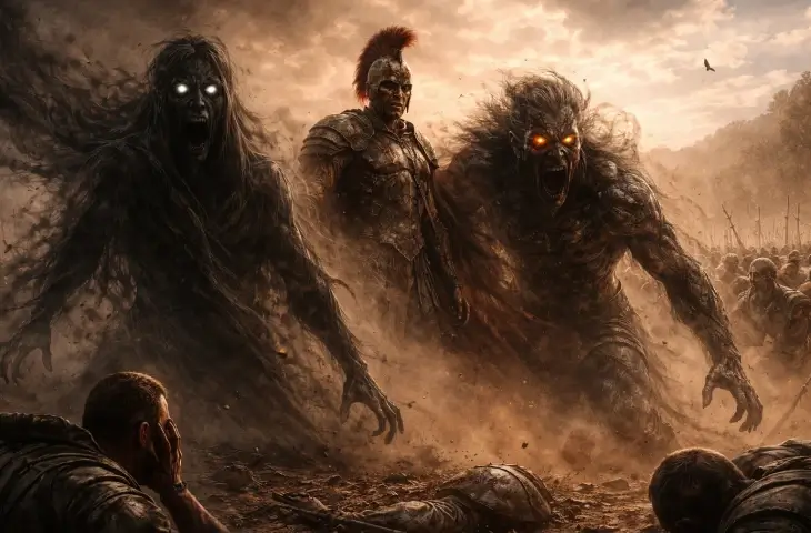 Ares burada zaferle anlatılan taraftan çok, en karanlık yüzüyle öne çıkar. Onun için savaş bir amaç değildir; bir patlama anıdır. Düzenli orduların ilerleyişinden çok, çatışmanın tam merkezinde yükselen bağırışlar, akan kan ve kontrolsüz öfke onun alanıdır.