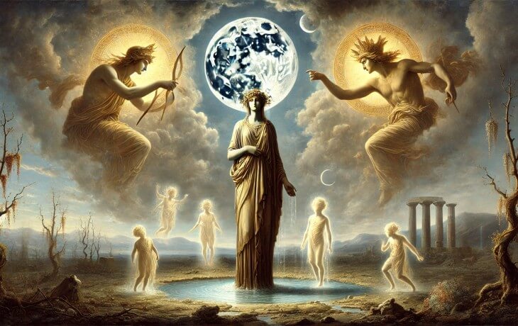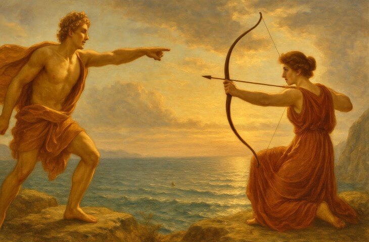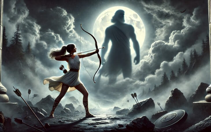 Artemis’in bu büyük savaştaki varlığı, onun mitolojideki iki yüzünü aynı anda aydınlatır: vahşi doğanın efendisi olan avcı ile kozmik düzenin bekçisi olan tanrıça birleşir. Okları artık yalnızca bir geyiği avlamaz; kaosa yönelmiş taşkın güdüyü hedef alır. Efsanenin bazı yorumlarında, Artemis’in stratejisi mesafe ve ışık üzerinedir: gündüz Apollon’un güneş oka benzer ışığıyla, gece Artemis’in ayı gibi serinleyen görüşüyle devlerin ham gücüne üstün gelinir. Bu yüzden ikizlerin omuz omuza duruşu, savaşın şiirinde gece ve gündüzün ortak disiplini gibi okunur.