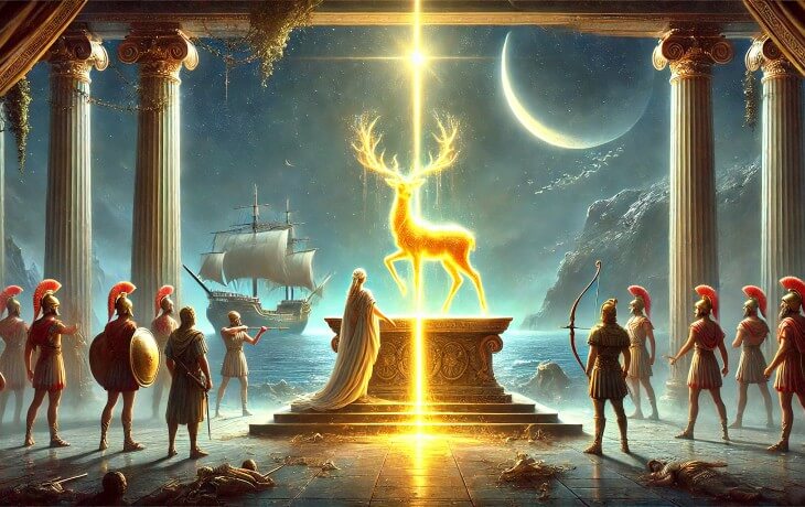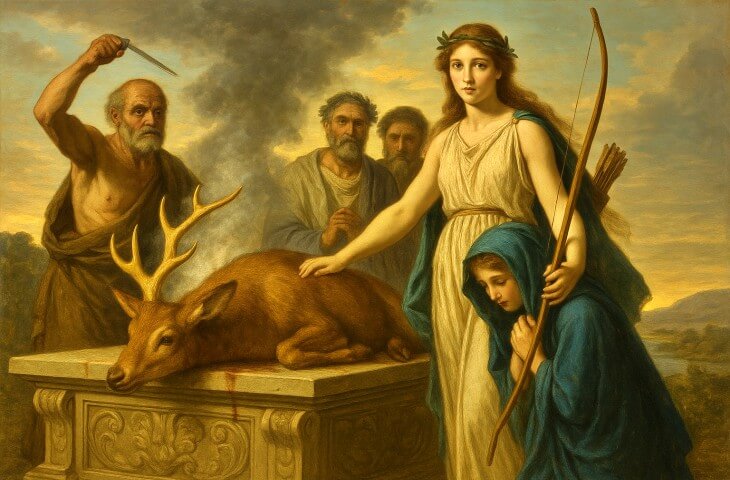 Troya Savaşı’nın fitilini, Sparta Kraliçesi Helene’nin Paris tarafından kaçırılması ateşlediğinde, Tyndareos Andı gereği Yunan kralları Menelaos’un yanında savaşmaya söz vermişti. Orduların başkomutanlığı ise Mykenai kralı Agamemnon’a verildi. Yüzlerce gemiden oluşan Akha donanması, Boeotia kıyısındaki Aulis’te toplandığında işler birden tersine döndü: rüzgar bir anda kesildi, deniz cam gibi durdu. Günlerce, haftalarca tek bir esinti bile olmadı; sefere çıkılamıyordu. Kutsal sessizliğin sebebi kısa sürede anlaşıldı: Artemis öfkeliydi.
