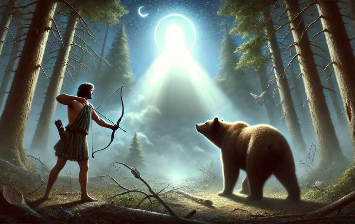 Artemis’in maiyetindeki en güzel ve en sadık nymphae’lerden biri olan Callisto, Arkadia Kralı Lykaon’un kızıydı. Artemis’in yanında yer alabilmek için bakirelik yemini etmişti; çünkü tanrıçanın çevresine katılan herkes gibi onun da aşkı ve evliliği reddetmesi gerekiyordu. Fakat bu kutsal yemin, Zeus’un hilekarlığı yüzünden bozuldu. Tanrıların kralı, Callisto’nun güvenini suistimal ederek kimi anlatılarda Artemis, kimi anlatılarda Apollon kılığına büründü ve genç kızı kandırdı. Callisto hamile kaldı ama bunu uzun süre gizlemeyi başardı.