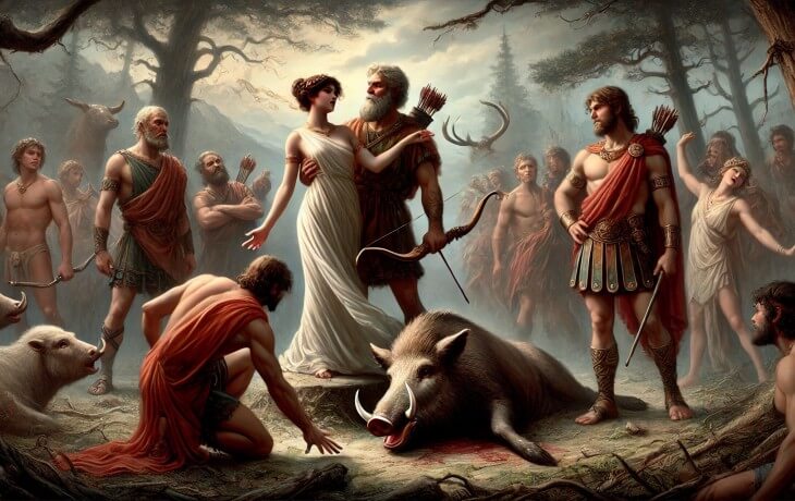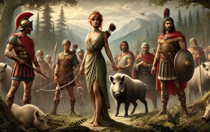 Yunan mitolojisinin en ünlü avlarından biri, Artemis’in gazabıyla başlamıştır: Kalydon Domuzu Avı. Aitolia bölgesindeki Kalydon kralı Oineus, hasat şenliklerinde bütün tanrılara adak sunar ama Artemis’i unutur. Gururu incinen tanrıça, Kalydon’un topraklarını cezalandırmak için devasa bir domuz gönderir. Bu canavar, tarlaları yakıp yıkar, insanları öldürür, kenti felç eder.