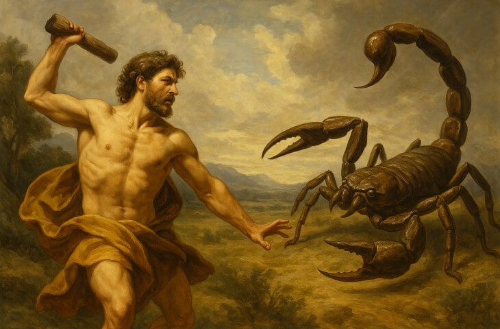 Birinci versiyona göre Orion’un hikayesi, kibirle doğaüstü güçlere meydan okumasıyla başlar. Yeryüzündeki tüm hayvanları avlayabileceğini ilan eder. Bu küstahlık, toprağın tanrıçası Gaia’yı öfkelendirir. Gaia, onun üzerine dev bir akrep salar. Akrep Orion’u zehirler ve öldürür. Bu olayda Artemis’in doğrudan bir rolü yoktur; ama sevdiği dostunun ölümü tanrıçayı derinden yaralamıştır. Daha sonra Zeus, Orion’u ve akrebi gökyüzüne takımyıldız olarak yerleştirir. Bugün gökyüzünde Orion ve Akrep takımyıldızlarının birbirinden uzak durması, bu efsanenin göksel izidir.