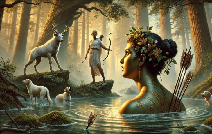 Avcı Akteon, ormanda dolaşırken Artemis’in nymphalarıyla birlikte yıkandığı kutsal ırmağa rastlar. Tanrıçayı çıplak halde gören ölümlünün akıbeti bellidir: Artemis öfkeyle su serperek Akteon’u bir geyiğe dönüştürür. Kendi av köpekleri onu parçalayıp öldürür. Bu hikaye, tanrıçanın sınırlarını ihlal edenlere karşı acımasız yönünü anlatır ve doğanın kutsal alanına izinsiz girmenin cezasını simgeler.