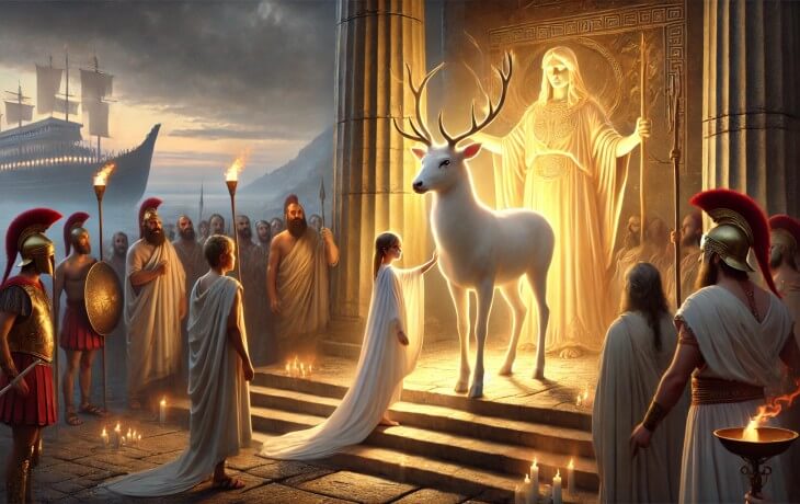 Troya Savaşı başlamadan önce Agamemnon, Artemis’in kutsal geyiklerinden birini öldürerek tanrıçayı gücendirir. Bunun üzerine Artemis, Aulis’teki rüzgarları keser; Yunan donanması hareket edemez. Kehanete göre Agamemnon’un kızı Iphigenia kurban edilmedikçe rüzgar esmeyecektir. Tam kurban gerçekleşmek üzereyken Artemis son anda kızı alır, yerine bir geyik bırakır ve Iphigenia’yı Tauris’e götürerek rahibesi yapar. Bu öykü, Artemis’in kurban ve merhamet arasındaki ikili doğasını gösterir.