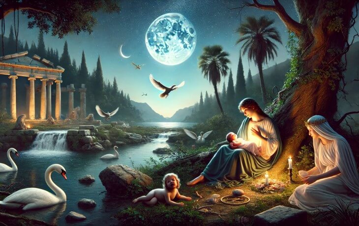 Hurma ve defne ağaçları, ay ışığı, kuğular ve tatlı su kaynakları Leto’nun doğum sahnesinin görsel alfabeleridir. Anadolu anlatılarında kuşlar ve rüzgar, doğumun habercisi gibidir; Delos versiyonunda ise hurma gölgesi ve tanrıçaların sessiz dayanışması öne çıkar.