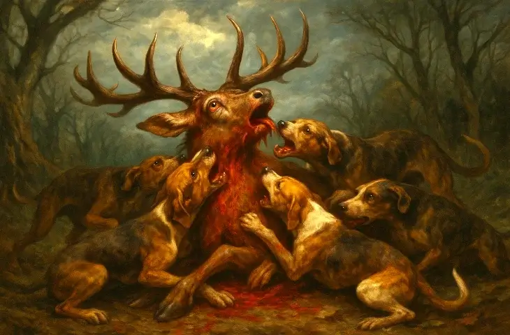 İlk ısırık ense köküne geldi. Ardından bir diğeri… ve bir diğeri. Toprak, kanın sıcaklığıyla buğulandı. Orman, bir yırtılma sesine karışan fısıltılarla yankılandı. Aktaion’un gözleri gökyüzüne çevrildiğinde, içinde hala insanın hatırası parlıyordu. Artemis’in bakışı kadar soğuk, doğa kadar kesindi bu son sahne.
