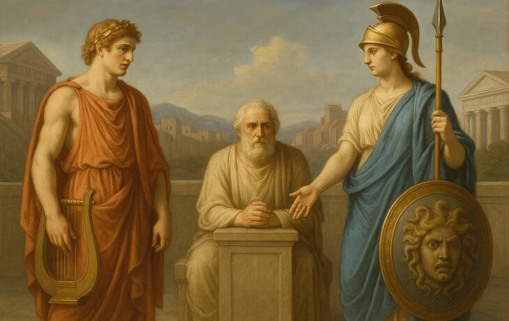 Apollon kehanet, düzen ve ışıkla; Athena akıl ve adaletle ilişkilidir. Troya Savaşı’nda karşı saflarda yer alırlar (Apollon Troyalıları, Athena ise Akhaları destekler). Buna rağmen ikisi de nomosu (düzen/yasa) temsil eder: Aiskhylos’un Eumenides’inde Orestes davasında Athena mahkeme kurumunu kurar, Apollon tanıklık yapar. Bu mit, kan davasından hukuka geçişin ilk adımını ifade eder.