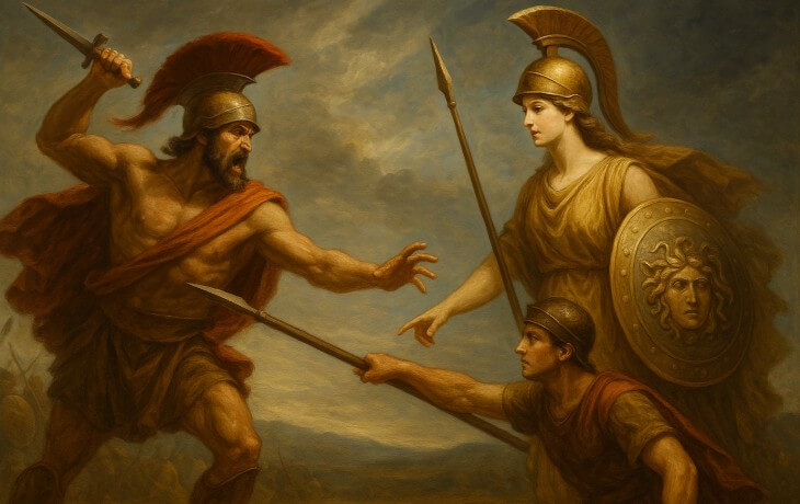 Ares kaba güç ve öfkeyi; Athena ise strateji, disiplin ve adaleti temsil eder. İlyada’da Athena, Diomedes’i yönlendirerek Ares’in yaralanmasına sebep olur; başka sahnelerde de Ares’i alt eder. Bu karşıtlık, Yunan zihninde “aklın kaba kuvveti yenmesi”nin mitolojik ifadesidir.