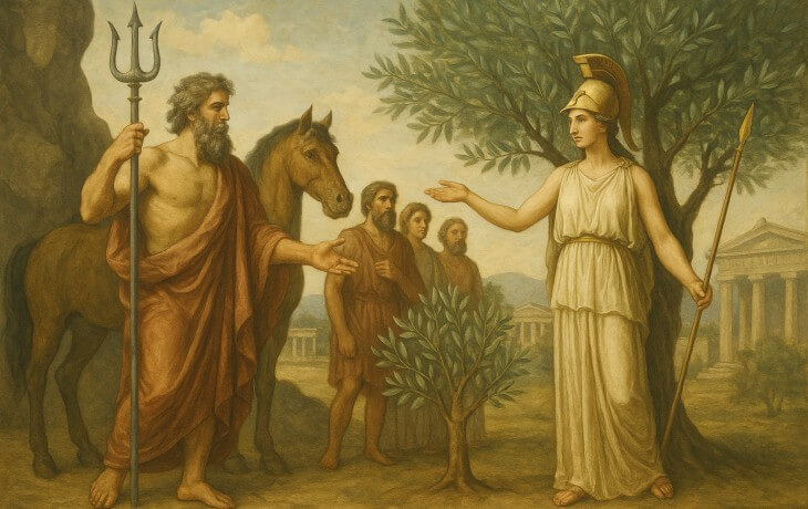 Atina’nın koruyuculuğu için yarışan Poseidon ve Athena, kente en değerli armağanı sunmak üzere karşı karşıya geldiler. Poseidon, üç dişli yabasını yere vurarak ya tuzlu bir su kaynağı ya da bir at çıkardı; bu armağan gücü ve denizcilik kudretini simgeliyordu. Athena ise toprağa bir zeytin ağacı dikti; bu armağan hem barışı hem de bereketi temsil ediyordu. Halk, yaşamın sürekliliğini sağlayan zeytini seçti ve şehir, koruyucu tanrıçasının onuruna “Atina” adını aldı.