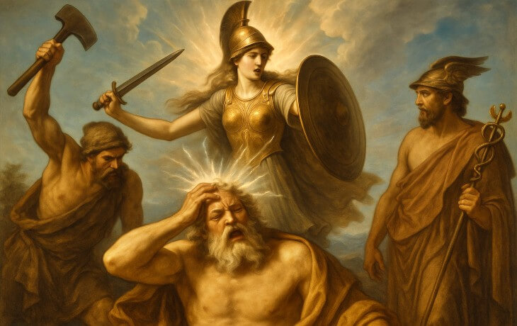 Zeus, bilgelik tanrıçası Metis’i yutmuştu; çünkü kehanete göre ondan doğacak çocuk babasından bile güçlü olacaktı. Ancak kader kaçınılmazdı. Bir gün Zeus’un başında dayanılmaz sancılar başladı. Hephaistos’un baltasıyla Zeus’un kafası yarıldığında, tam zırhlar içinde, elinde mızrağı ve kalkanıyla Athena fırladı. Bu olağanüstü doğum, onun bilgelik, stratejik savaş ve adalet tanrıçası kimliğini şekillendirdi.
