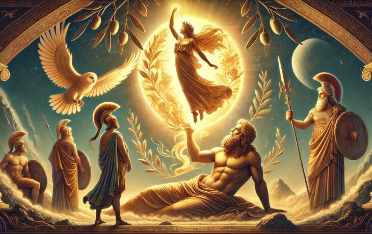 Athena, Metis’in Zeus tarafından yutulması sonrası Zeus’un başından zırhlı doğar; bu nedenle zihnin/aklın beden bulmuş hali olarak görülür. Zeus’un en sevdiği ve güvendiği çocuğu sayılması, ona Aegis’i (korku salan kalkan) taşıma ayrıcalığı ve tanrısal danışman rolü verir.