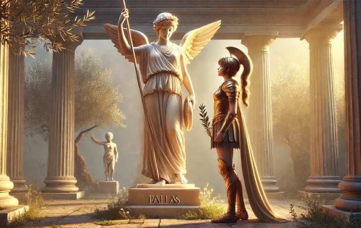 Athena’nın mitolojideki en dokunaklı hikayelerinden biri, çocukluk arkadaşı Pallas ile olan talim sahnesidir. Rivayete göre iki arkadaş, gençliklerinde savaş oyunları ve mızrak talimleri yaparken birbirlerine denk düşecek kadar yetenekliydi. Ancak bir gün girdikleri mücadele, ölümcül bir kazayla sonuçlandı. Athena’nın gücü farkında olmadan Pallas’ı yaraladı ve çok sevdiği dostunun hayatını kaybetmesine neden oldu.
