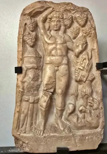 MÖ 500’e tarihlenen bu sahnede Dionysos, elinde şarap kadehi ve üzüm asmasıyla betimlenir. Arkasında üzüm toplamaya çalışan satir Briachos, karşısında ise thyrsos ve yılan taşıyan Bakkha Erophyllis yer alır. Üç figür birlikte Dionysos’un doğa, coşku ve ritüel ile kurduğu bağı yansıtır.