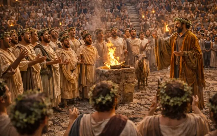 Bu bağ, sonradan kurulmuş bir ilişki değildir. Tiyatronun doğduğu ortamın merkezinde gerçekten Dionysos kültü yer alır. Atina’da düzenlenen Büyük Dionysia ve Lenaia gibi festivaller bunun en açık örnekleridir. Bu festivallerde insanlar yalnızca eğlenmek için bir araya gelmez. Alaylar düzenlenir, kurbanlar sunulur, tanrı adına törenler yapılır. Ama bütün bu kalabalığın içinde asıl dikkat çeken şey, birlikte yapılan o ritmik anlatımdır. Yani koro...