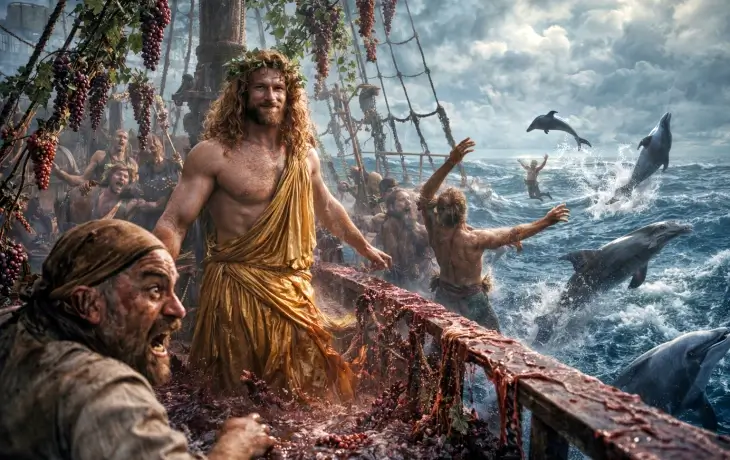 Bir grup korsan, Dionysos’u sıradan bir genç sanarak kaçırır. Onu bir tanrı olarak görmezler ve taşıdıkları kişinin kim olduğunu anlamazlar. Ancak yolculuk sırasında gemide tuhaf şeyler olmaya başlar. Direklerden asmalar sarkar, ortamı yoğun bir şarap kokusu kaplar ve geminin içindeki hava yavaş yavaş değişir. Gerçeklik, alıştıkları düzenin dışına taşar.