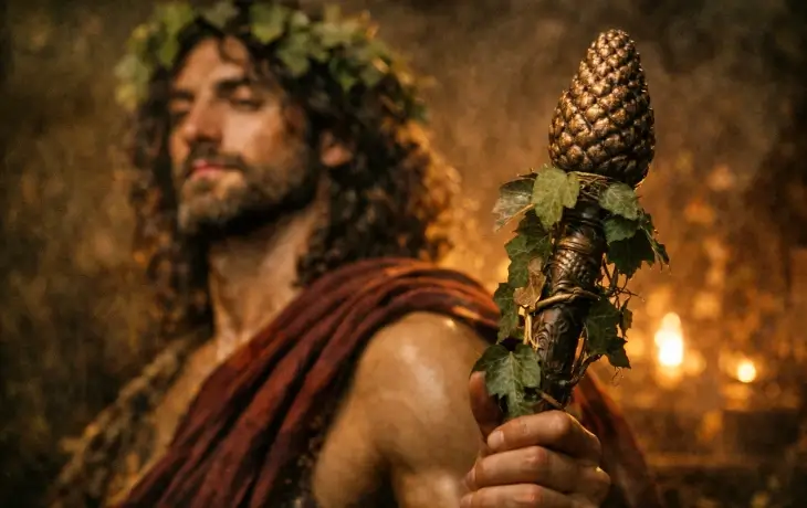 Dionysos’un en bilinen sembollerinden biridir. Ucu çam kozalağıyla süslenmiş bu asa, dışarıdan bakıldığında zarif görünür. Ancak aynı zamanda güç ve otoriteyi de temsil eder. Bu yönüyle thyrsos, Dionysos’un doğasını yansıtır: Yumuşak görünen ama etkisi derin olan bir güç.