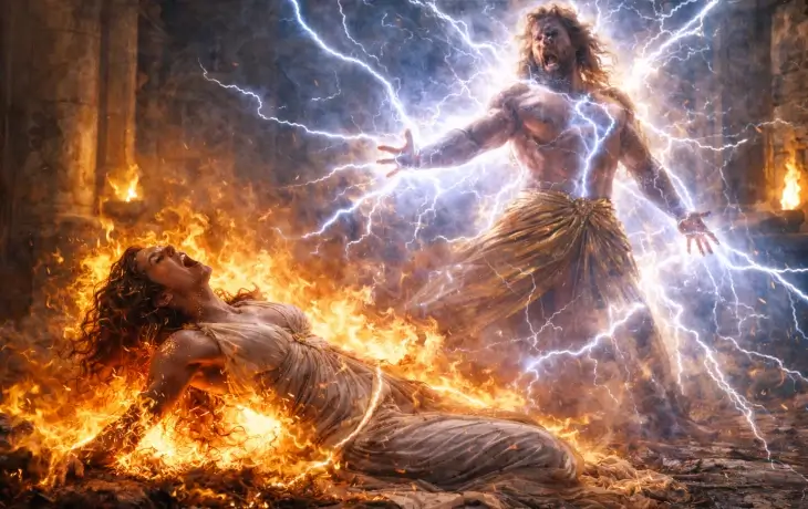 Zeus, bu isteğin sonucunu bilir. yani bir ölümlünün onun gerçek formuna dayanamayacağını bilir. Ancak geri çekilmesi mümkün değildir. Çünkü Styx Nehri üzerine yemin etmiştir. Kendisini olduğu gibi gösterdiği anda ortam değişir. Bu, insanın algılayabileceği bir görüntü değildir. Yıldırımlar, yoğun ışık ve tanrısal güç aynı anda ortaya çıkar. Semele bu güce dayanamaz ve o anda yok olur.