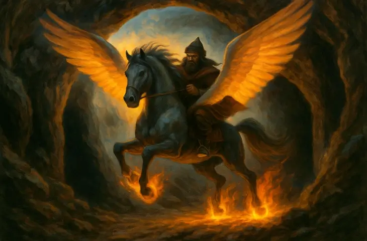 Bir söylenceye göre, kahraman yeraltının karanlık labirentlerinde kaybolduğunda, Tulpar gökyüzünden inerek mağaranın ağzına kanatlarını açar. Kahraman sırtına atladığında, Tulpar’ın toynakları alev alır ve her bir zıplayışında yer sarsılır, gök aydınlanır. O an, karanlıktan kurtuluşun ve ruhun özgürleşmesinin anıdır.