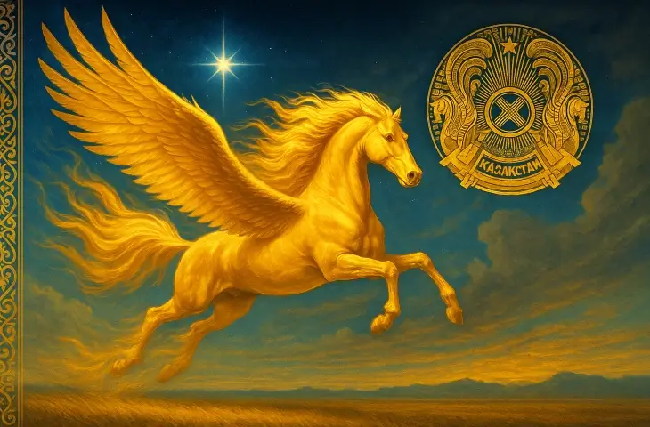Kazakistan’ın devlet armasındaki kanatlı altın at figürü, doğrudan Tulpar mitinden gelir. Mavi zemin üzerindeki iki simetrik Tulpar, göğü ve yeryüzünü birbirine bağlayan ilahi dengeyi temsil eder. Orta kısımdaki şanyrak (yurt kubbesi) sembolüyle birleştiğinde, bu arma gök – aile – vatan üçlemesinin en görkemli ifadesine dönüşür.