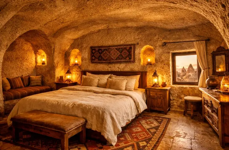 Butik mağara otel tercih edenler için öncelik genellikle otantik atmosferdir. Oda içi donanım lüks segment kadar geniş olmayabilir; ancak yapının karakteri daha belirgindir.