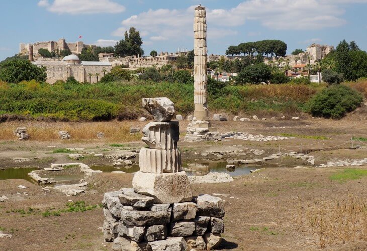 Bir zamanlar dünyanın Yedi Harikası arasında sayılan görkemli Artemis Tapınağı’ndan bugün geriye çok az şey kaldı. Selçuk merkezinde, St. Jean Bazilikası’nın eteklerinde bulunan tapınak alanında artık sadece birkaç mermer blok ve tek bir sütun parçası ayakta duruyor. Çevresi açık hava düzenlemesiyle ziyarete açık; buraya gelenler, tapınağın bir zamanlar kapladığı devasa alanı hayal ederek geçmişin ihtişamını zihninde canlandırabiliyor.